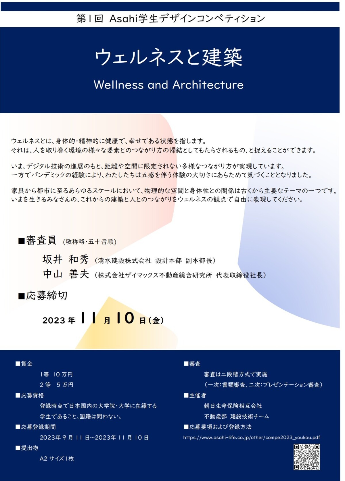 朝日生命保険相互会社(社長:木村博紀、以下「当社」)は、国内の大学・大学院に在籍する学生を対象に日頃の学習成果や課題解決力を発信・表現する場の提供を目的とした「第1回Asahi学生デザインコンペティション」を開催いたしました。第1回目となる本コンペティションでは「ウェルネスと建築」をテーマに作品の応募を受け付けました。計32点の応募作品の中から厳正なる審査の結果、5作品(1等1作品、2等1作品、入賞3作品)が選考・受賞となりましたのでお知らせいたします。