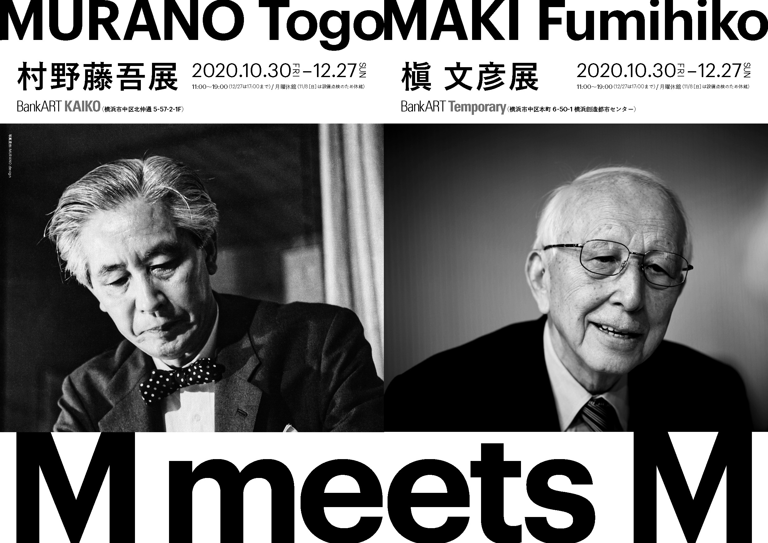 M meets M。ちょうどひと世代の差がある二人の建築家が、ここ横浜の街で出会います。大規模再開発が決まり、一部は保存されますが、惜しまれながら姿が消えていく村野の旧庁舎。一方、6,500人の職員を包括し、横浜の新しい発信基地としてスタートした槇の新市庁舎。2020年、この新旧のリレーが展開されています。この機を捉えて、二人の日本を代表する建築家の展覧会を開催したいと思います。場所は、道路を挟む「旧帝蚕倉庫」と「旧第一銀行」を復元/リノベーションしたアートスペース。二人の偉大な建築家と二棟の歴史的建造物のコラボレーションに是非ご期待ください。