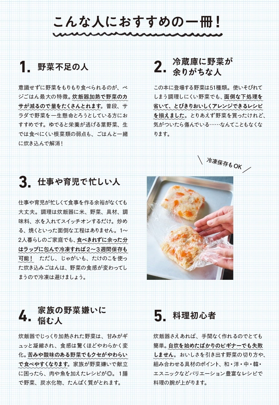 お米2合に対して、ブロッコリー1株、にんじん2本、トマト2個、ピーマン5個、豆苗1袋など驚くほど野菜をたっぷり入れます。健康のためにも、美容のためにも、日々の食事で野菜をおいしく、たくさん食べたい方にオススメ。また、旬の野菜が主役の70メニューを掲載、春夏秋冬どの季節でも楽しめる一冊です!
