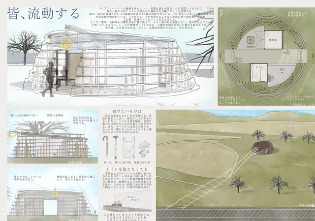 地域の歴史にしっかりと目を向けた提案です。かつてこの地域に存在した山形交通三山線(1974〈昭和49〉年廃線)について触れ、現在も一部区間において線路跡が遊歩道や自転車道として整備されていることに注目している点は、地域の記憶と空間を丁寧に読み解こうとする姿勢が感じられます。建築として最も魅力的だと感じたのは、雪国の気候を肯定的に捉えた空間構成です。建物を覆うようにかけられた大きなルーバー状の庇は、夏には木陰を生み出し風が抜ける開放的な空間をつくり、冬には雪が積もることで隙間が埋まり、風を適度に遮断して内部環境を守る構造になっています。特に印象的に感じたのは、積もった雪を透かして風景を見るという視点です。雪をただの厄介な自然条件としてではなく、設計の一部として取り込んだ美しい発想だと感じました。トイレと機械室を機能的に中央にまとめ、その上から大きく覆うような構成も、雪に覆われる地域での合理的かつ柔らかなデザインアプローチと言えるでしょう。実際の運用には床暖房やロードヒーティングなどの設備的配慮が求められるとは思いますが、建築が気候と対話しているような提案は好感が持てます。また、「人のためだけでなく、鳥のためにもなる建築」という視点に、設計者の優しいまなざしが感じられ、空間に宿る物語性をより豊かなものにしています。※今回応募が少なかった高等専門学校の作品です。専門学校生対象とタイトルに使ってますが、高専生大歓迎です!(本多)