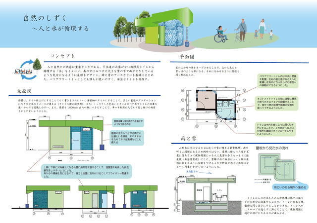 本提案は、与えられた課題文の趣旨を最も誠実に読み解いた上で構想された提案です。ローヤルエンジニアリングの考え方、つまり、トイレの汚水を濾過・分解し、再利用するシステムを導入することで、川に流れる水を美しく保ち、かつ資源を循環させるという環境負荷の少ない仕組みを建築に丁寧に反映しています。建物形状は、2枚の葉が広がるような屋根形状を採用し、雨水を一点に集約して周辺の植栽への散水に活用する仕組みを備えている点も好感が持てます。※ローヤルエンジニアリングのシステムでは、雨水を手洗いに濾過、殺菌して利用します。さらに、外観そのものが水の循環や自然との共生を視覚的に想起させる造形であることも、地域の人々や訪問者にとって、環境配慮の意識を喚起する装置として機能する可能性を持っています。建築は使われるだけでなく、語りかける存在でもあるという点において、本提案はその力可能性を持っています、惜しいところは、人の目線でも2枚の葉の様に見えるデザインにするか、水の流れを意識できるデザインにできると、さらに良くなったでしょう。(本多)