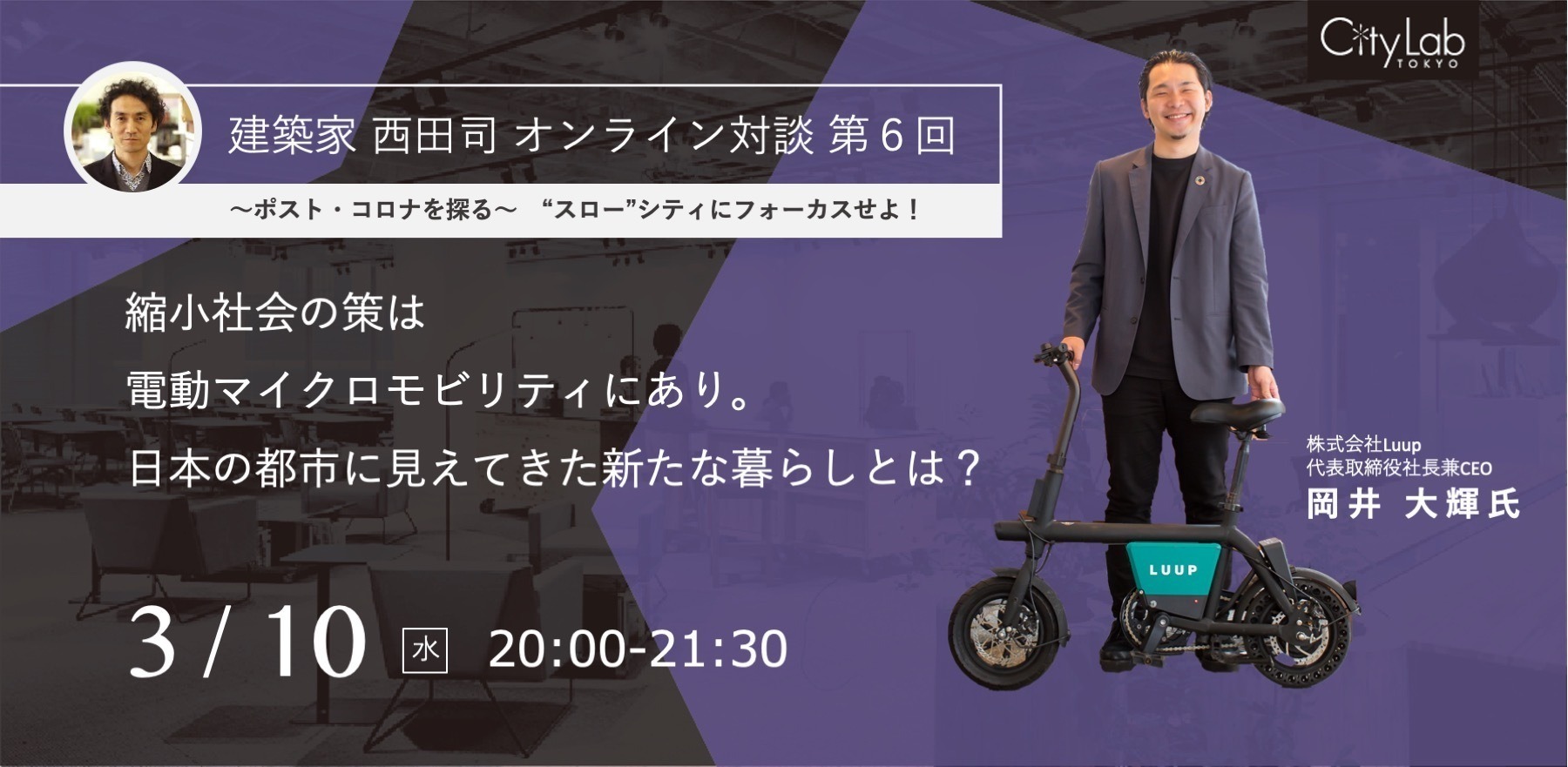 聞きに行く(終了) 【3/10@オンライン】建築家・西田司氏対談 ~ポスト・コロナを探る~ 第6回 縮小社会の策は電動マイクロモビリティにあり。 日本の都市に見えてきた新たな暮らしとは?[Luup] produced by シティラボ東京 2021.03.04